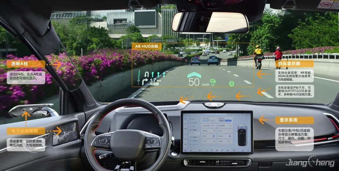 基于復雜變量環境完成大尺寸、小體積的光機設計,并采用多數據融合算法實現導航、ADAS等輔助駕駛信息在真實路況上的疊加、融合顯示,提升駕駛安全性的同時給予更酷炫、更智能的駕駛體驗。